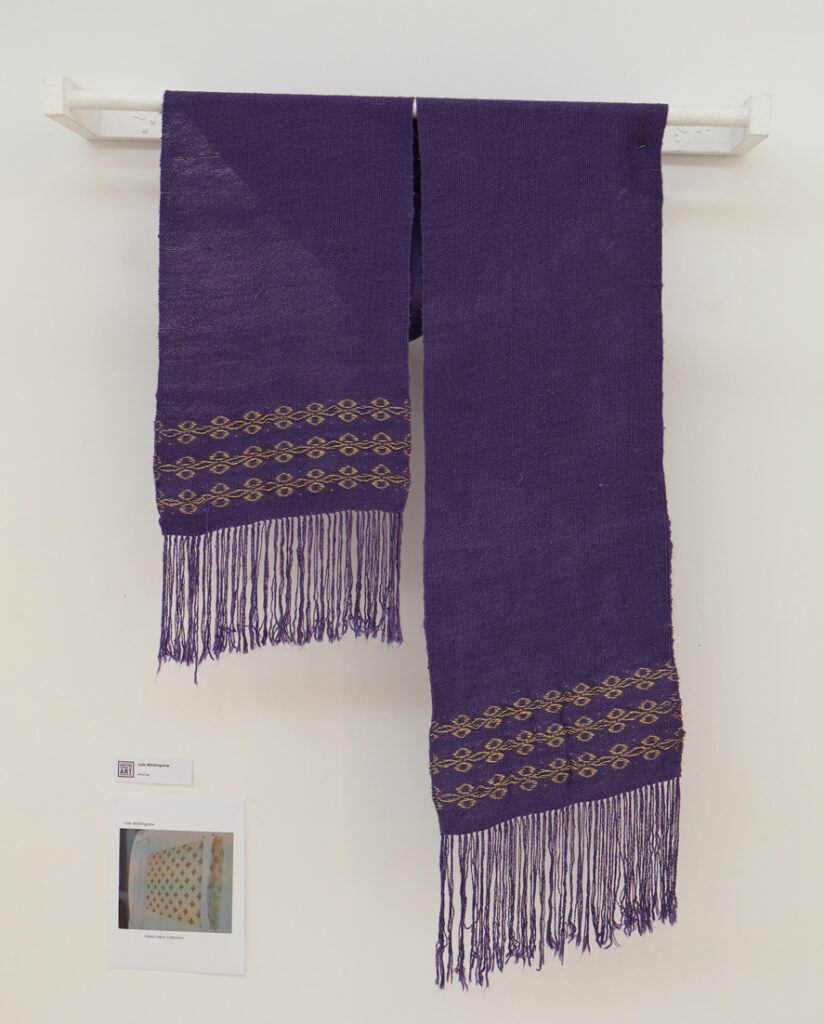 I adapted the inspiration piece to an overshot weave with golden thread on a tabby background of bamboo.